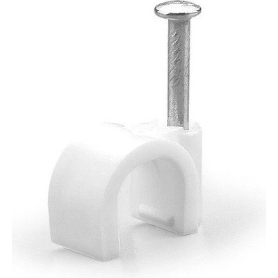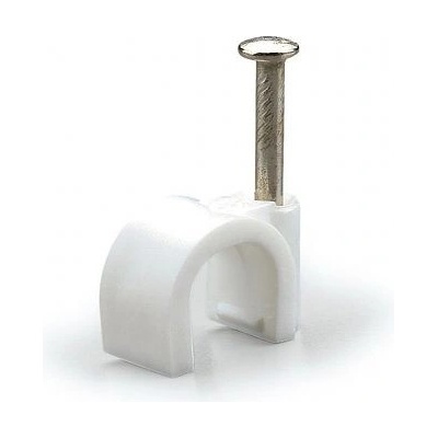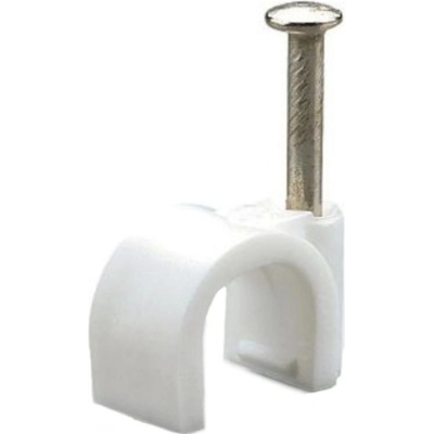 Bílá plastová příchytka na kabel průměru 10 mm s hřebíkem. Pro uchycení kabelu na stěnu pomocí plastového držáku a zatloukacího hřebíku.