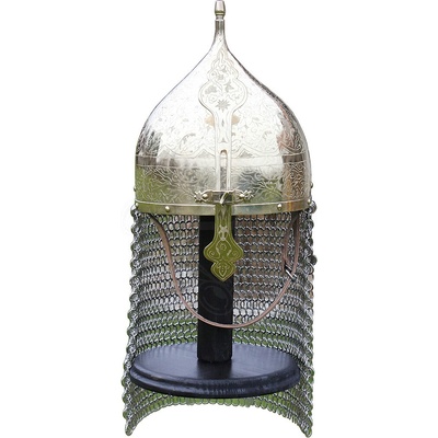 Přilba Saladin Naše přilba Saladin se skládá z cca 1,5mm silného mosazného plechu, jež je na povrchu bohatě zdoben rytinou orientálního vzoru. Kónický zvon přilby se na vrcholu...