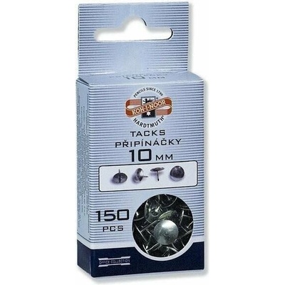 Připínáčky, průměr drátu 10 mm, průměr hlavy 10 mm, výška 10 mm, kovové. 150 ks připínáčků je uloženo v papírové krabičce. Připínáčky se používají např. na připevnění papírů na...