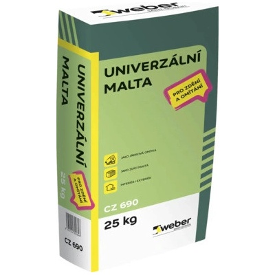 Malta Weber CZ 690 univerzální 25 kg Tato univerzální malta je určená pro zdění i omítání, pro ruční zpracování. Hodí se jako podklad pro jemné a minerální omítky v interiéru i...