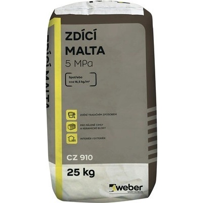 Malta Weber CZ 910 zdicí 5 MPa 25 kg Malta Weber CZ 910 zdicí 5 MPa 25 kg. Tato suchá maltová směs je určená pro běžné zdění, pro ruční zpracování, a hodí se pro použití v...
