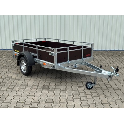 Nebrzděný přívěs s celkovou hmotností 750 kg. Provedení s "V" ojí, plechové bočnice s Al-Zn úpravou, 13" kola, 7pólová elektroinstalace, podlaha je vyrobená z voděodolné...