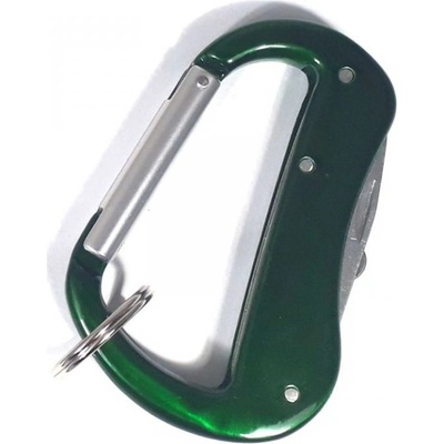 Karabina a skládací nožík v jednom, v zeleném provedení, vhodné k pověšení na klíče nebo batoh.