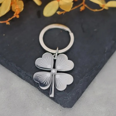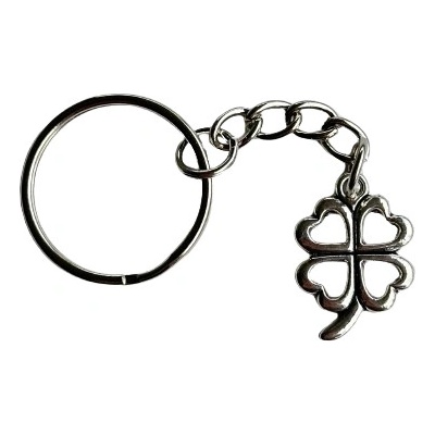 Ocelová klíčenka se čtyřlístkem. Tento čtyřlístek sice na louce neroste, ale i tak může přinést štěstí!