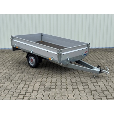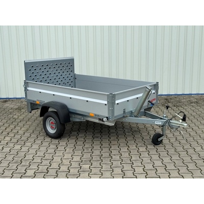 Jednonápravový, nebrzděný valníkový přívěs s koly vedle ložné plochy. Přívěs má hliníkové bočnice o výšce 350 mm a podlahu z voděodolné překližky. Zadní čelo přívěsu je...