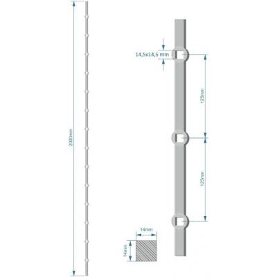 Probíjená tyč délky 2000 mm, opískovaná, profil 14 x 14 mm, rozteč děr 125 mm, oko 14,5 x 14,5 mm, na tyči je 14 děr
