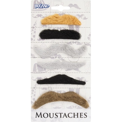 Sada 6 ks různobarevných knírů, které se také liší svým tvarem. Potřebné doplňky ke kostýmům na karnevalovou nebo tématickou párty. Kníry jsou samolepící.