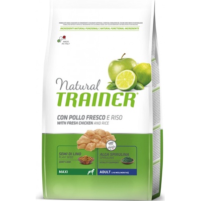 Granule Natural Trainer Maxi Adult prosciutto crudo a rýže jsou kompletním krmivem určeným speciálně pro dospělé psy velkých plemen. Pro zajištění výjimečné chuti tohoto krmiva na bázi kuřecího masa byla přidána 100% italská šunka prosciutto crudo. Granule Natural...