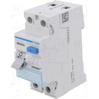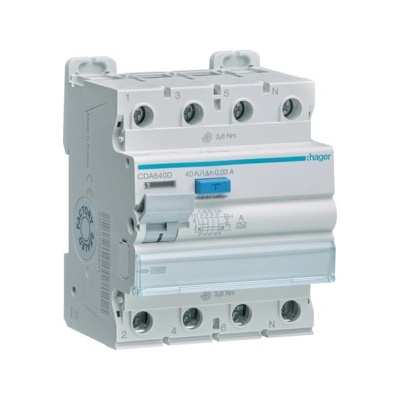 CDA440D Proudový chránič, 4P, 40A, 30mA, 6kA, typ: A, Hager Proudové chrániče reagující na střídavé i stejnosměrné pulzující proudy. Jmenovité napětí na 230 V~ Citlivost na...