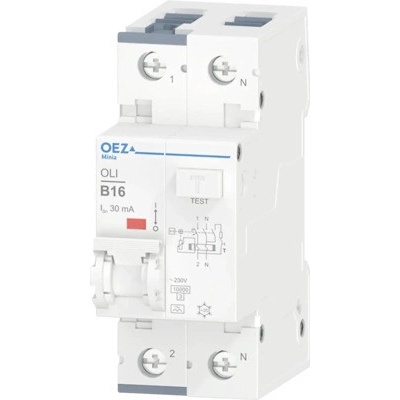 OEZ OLI jističochránič 1+N, B16, 30 mA, typ A, 230 V, vypínací schopnost 10 kA.