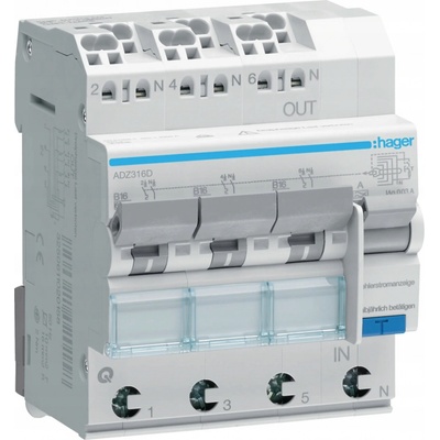 RCBO Proudový chránič s nadproudovým členem 3x1P+N 6kA B 16A/30mA Typ A QC/QBB Hager ADZ316D Design - Počet chráněných pólů: 3 - Počet pólů: 4 P - Rozložení pólů: 3x 1P+N -...