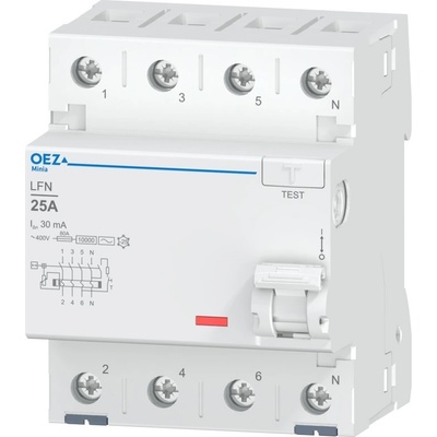 Proudový chránič OEZ 42411 LFN-63-2-030AC na DIN lištu s maximálním proudem 63 A a jmenovitým reziduálním proudem 30 mA, 2-pól, zkratová schopnost 10A, typ AC, k ochraně...