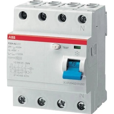 F204A-25/0,3; proudový chránič; čtyřpólový; jmenovitý proud: 25 A; citlivost: 300 mA; Typ A – pro střídavý a pulzující stejnosměrný reziduální proud (určeno pro 1f obvody s...