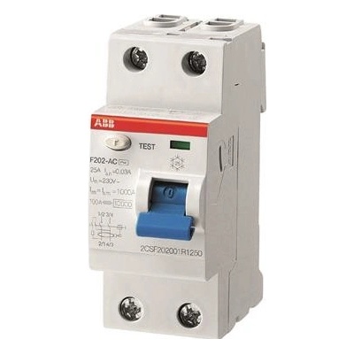 F202AC-100/0,03; proudový chránič; dvojpólový; jmenovitý proud: 100 A; citlivost: 30 mA; Typ: AC – pro střídavý reziduální proud (určeno pro obecné zátěže)