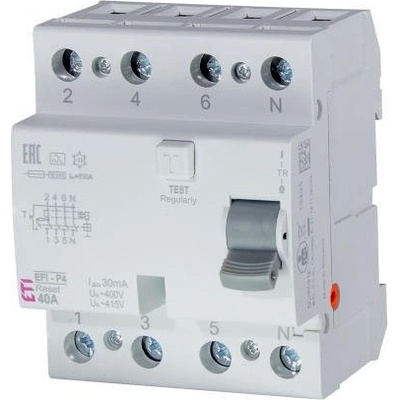 Specifikace Kód ETI: 002061212 Popis: EFI-P2 AC 40/0.03 Jmenovitý reziduální proud (A): 0.03 Typ proudu: AC Jmenovitý proud (A): 40 Typ: AC Počet pólů: 1+N Jmenovitý podmíněný...