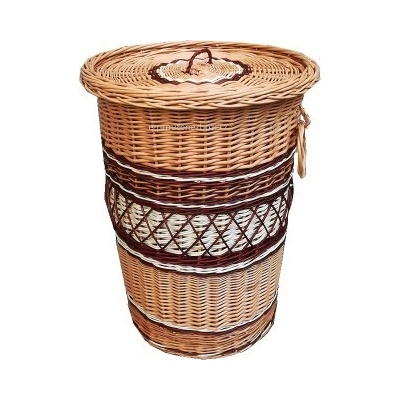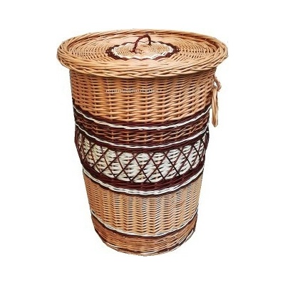 Kulatý proutěný koš na prádlo s režnou bílou látkou, kterou je možné sejmout a vyprat. Barva hnědá. Rozměry: průměr 38 cm, výška 47 cm