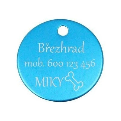 Hliníková identifikační psí známka.Za příplatek lze jednostranně opatřit destičku rytinou textu nebo drobným obrázkem.Přívěšek má povrchovou úpravu ve světle modré barvě.
