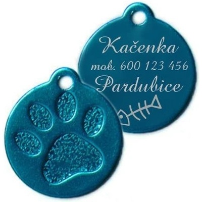 Hliníková identifikační psí známka s vyraženou tlapičkou. Vzhledem k menší velikosti známky je tato známka vhodná i pro kočičky Za příplatek lze na zadní stranu destičky...