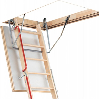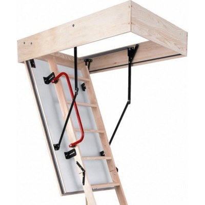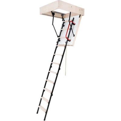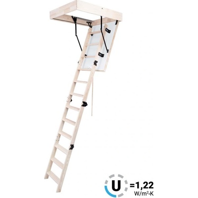Ekonomická varianta skládacích půdních schodů s dřevěným žebříkem. Schody jsou vybaveny těsněním a tyčí pro manipulaci.
