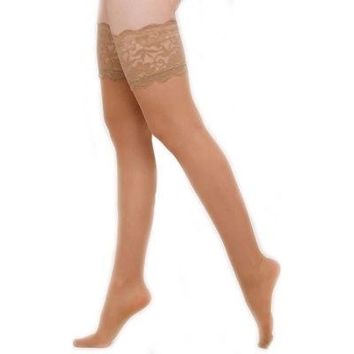 Tenké, lehce průhledné punčochy s vláknem Lycra. Krajka 14 cm široká, s dvojitým silikonovým proužkem. Tloušťka 15 Den. Složení: 85% polyamid, 15% elastan.