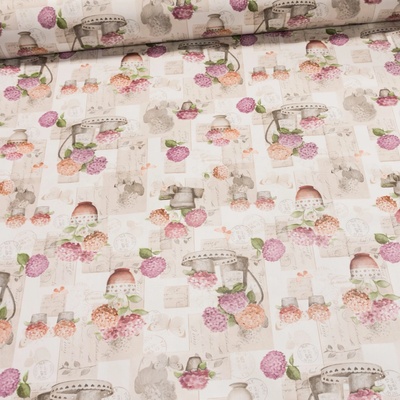Omyvatelná PVC ubrusovina s podkladem z netkané textilie se vzorem růžových hortenzií v různých nádobách na béžovém podkladu s hladkým povrchem. Ubrus je dostupný v metráži o...
