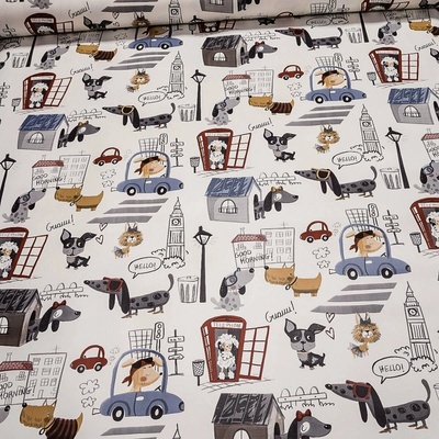 Omyvatelná PVC ubrusovina s podkladem z netkané textilie se vzorem pejsků na bílém podkladu s hladkým povrchem. Ubrus je dostupný v metráži o šířce 140cm.