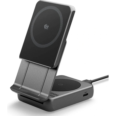 Rychlá 25W MagSafe nabíječka Spigen Essential EF302MOQ s Qi2 a funkcí 2v1 pro iPhone a TWS. Stabilní uchycení, skládací konstrukce a USB-C výstup — ideální pro práci i cestování.