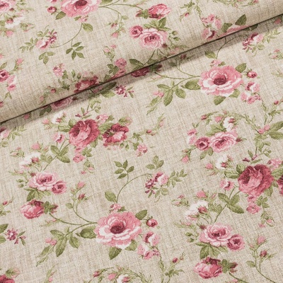 Směsová látka (tkanina) se vzorem růžových růží se zelenými listy na podkladu se vzorem pytloviny. Látka v šířce 140 cm a je vyrobena ze 55% bavlny a 45% polyesteru. Motiv na...