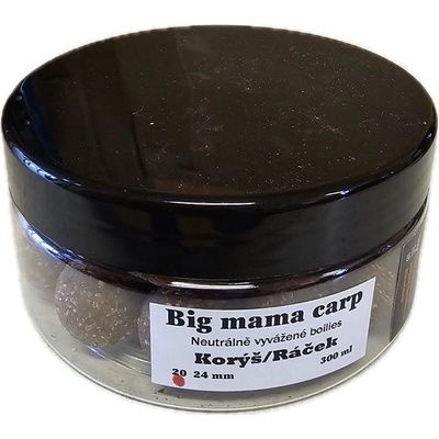 BigMama Boilies Neutrálně Vyvážené Korýš Ráček BP ASA 24 mm 300 ml Prémiové neutrálně vyvážené boilies, které kombinuje intenzivní aroma korýšů a ráčka s pikantním černým...