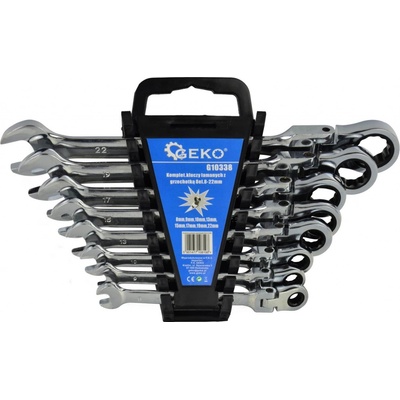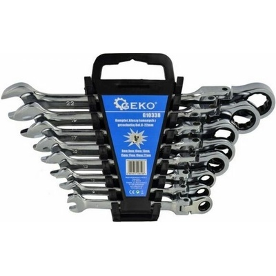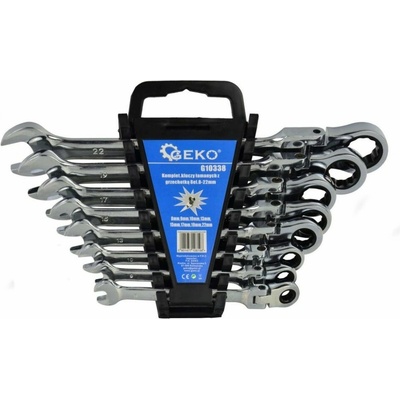 Klíče ráčnové očkoploché s kloubem, sada 8ks, 8-22mm, plast. držák, GEKO Specifikace: - velikosti: 8, 9, 10, 13, 15, 17, 19, 22mm