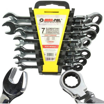 ráčnové klíče s kloubem, vyrobeno z crv oceli, sada 7 velikostí, vhodné do těžko přístupných míst, s plastovým držákem Klíče ráčnové očkoploché s kloubem 7ks 8-19mm MAR-POL...