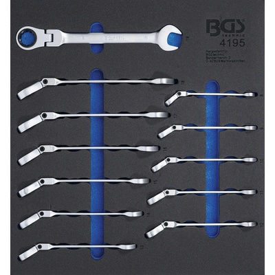 BGS 4195 Očkoploché klíče ráčnové s kloubem, 8-19 mm, 12 dílů v modulu Sada očkopochých klíčů s ráčnovým mechanismem (72 zubů) a kloubovou hlavou, 12 dílů v pěnovém modulu –...