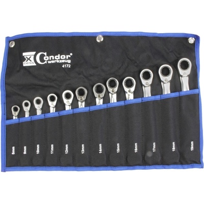 Očkoploché klíče s ráčnou a přepínáním směru vlevo/vpravo, vyhnuté očko o 15 stupňů, sada 12 kusů ve vinylovém obalu – 4Czech 4CZ-277R-512 Prakticky poskládaná souprava klíčů...