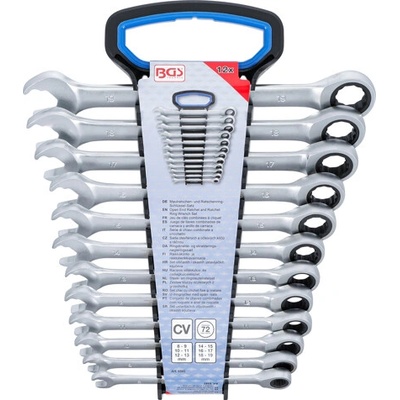 BGS 4195 Očkoploché klíče ráčnové s kloubem, 8-19 mm, 12 dílů v modulu Sada očkopochých klíčů s ráčnovým mechanismem (72 zubů) a kloubovou hlavou, 12 dílů v pěnovém modulu –...