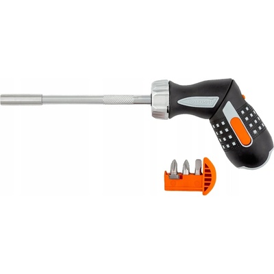 Ráčnový šroubovák Sada obsahuje 6 výměnných bitů s různými typy hrotů: PZ1, PZ2, PH2, SL4, TX25 a HEX5 Magnetický držák bitů bezpečně drží bity a zabraňuje jejich vypadnutí...