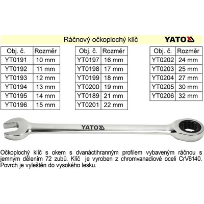 Číslo výrobku: YT-0202 Zjednodušené číslo výrobku: YT0202 OEM čísla (originální čísla automobilky): Ráčnový očkoplochý klíč Yato - na jedné straně klasický stranový klíč, na straně druhé očkový klíč s dvanáctihranným profilem vybaveným ráčnou s jemným dělením 72...
