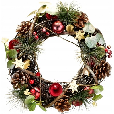 Ratanový věnec s eukaliptovými větvičkami Ø30 cm Dodáme vám první vůni Vánoc s tímto ručně vyrobeným ratanovým věncem. Zdobí ho eukaliptové větvičky, borovicové větvičky, červené kouličky, červené dřevěné kalíšky, dřevěné hvězdičky a pozlacené šišky a červené bobule....