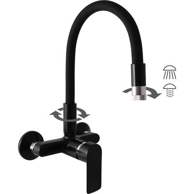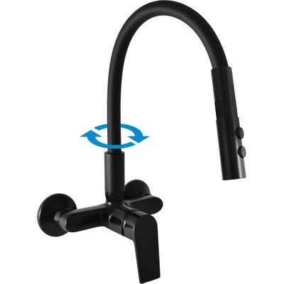 Vodovodní baterie dřezová nástěnná s flexibilním otočným ramínkem se sprchou. tato baterie je vybavena keramickými 1/2" vršky od německé firmy Flühs MD0093D provedení černá...