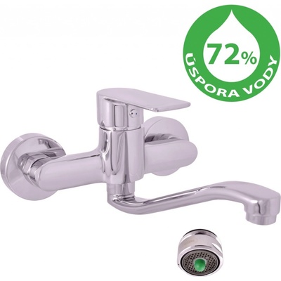 Spořící vodovodní baterie dřezová/umyvadlová nástěnná s plochým "S" ramínkem 195 mm. VLTAVA ECO - Ušetříte až 72% spotřeby vody! tato baterie je vybavena keramickou spořící...