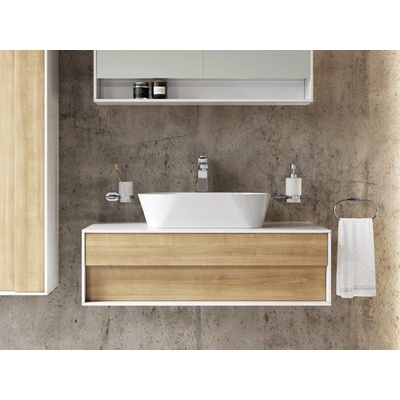 Skříňka pod umyvadlo na desku disponuje plnovýsuvnou zásuvkou, která přehledně uloží vše, co nemá být vidět. Design ve stylu překládaných dřevěných desek a výběr barevných...