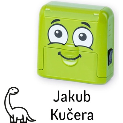 Veselé razítko na textil s motivem dinosaura a jménem dítěte. Jednoduchý a rychlý způsob označení dětského oblečení. Podepište dětem oblečení do školky, na tábor nebo školu v přírodě jedním stisknutím razítka a zabraňte tak nechtěným ztrátám nebo záměnám.