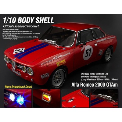 Obsah balení Obsahem balení je hotová karosérie pro RC modely aut 1:10 Alfa Romeo 2000 GTAm od Killerbody v červeném provedení. Karoserie bohatá na detaily - sada černých...