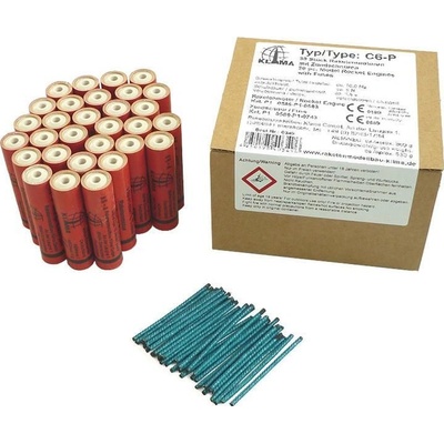 Charakteristika:Raketový motor Klima C6-P pro modely raket. Rozměr raketového motorku o18 x 70 mm, impuls 10 N·s, průměrný tah 6 N, doba hoření 1.6 s, bez výmetu. Hmotnost...
