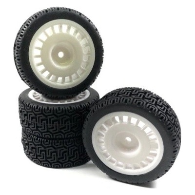 Kompletní univerzální kola pro RC auta Ford Fiesta ST Rally 1:10. V provedení bílý disk Rally s nalepenými pneumatikami Gravel (S1 super měkká směs).