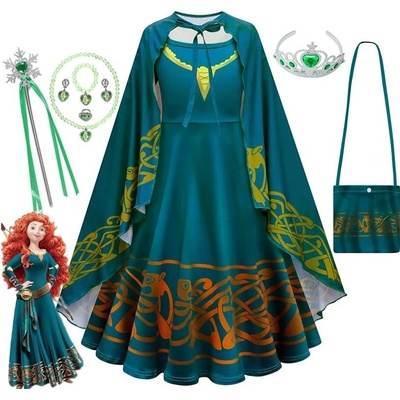 Krásný dívčí kostýmek princezny Meridy ze známé pohádky Rebelka. Balení obsahuje doplňky ke kostýmu - plášť, mini kabelka, korunka, hůlka a šperky. Vhodné na karneval....