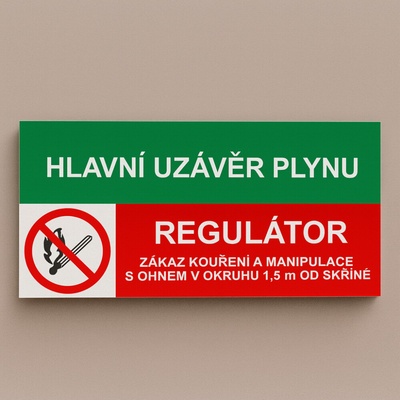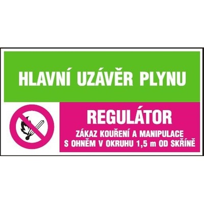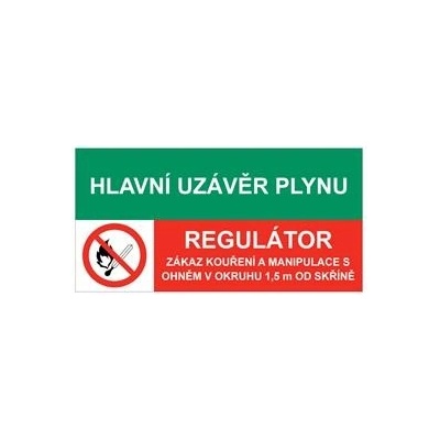 Hlavní uzávěr plynu - Regulátor - Zákaz kouření a manipulace s ohněm v okruhu 1,5 m od skříně - samolepka 150x80mm Obrázky jsou pouze ilustrativní.