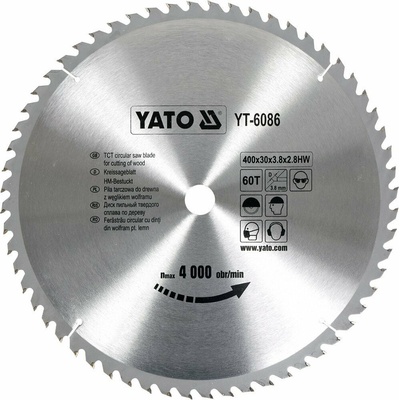 YATO YT-6086 KOTOUČOVÁ PILA 400X60X30 MM Číslo indexuYT-6086 Marka Yato Hrubá hmotnost (kg) 2.6500 Master Carton MC 10 Pal 240 Vnější průměr [mm] 400 Vnitřní průměr...