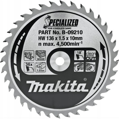 MAKITA ŘEZNÝ KOTOUČ 136 X 10 36Z B-09210 Vylepšené řezné kotouče vyrobené speciálně pro akumulátorové pily. Čepele pro práci dřevem s nejoblíbenějšími akumulátorovými modely...