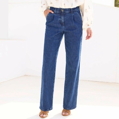 Rovné široké džíny se sklady kombinují eleganci a pohodlí. Běžná výška pasu. Tvarovaný pas, vpředu plochý, vzadu pružný. Zapínání na zip + 1 knoflík vpředu. 2 klínové kapsy...