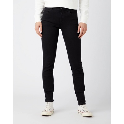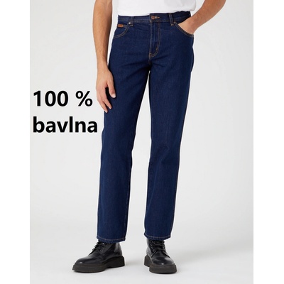 Temně modré nešoupané džíny s pěti kapsami a se zapínáním na zip. Přední kapsy jsou zdobeny hladkými nýty. V oblasti zapínání vyniká kovový knoflík s vyrytým logem WRANGLER....